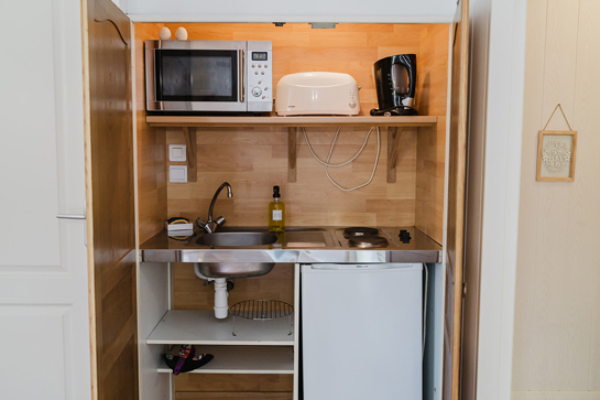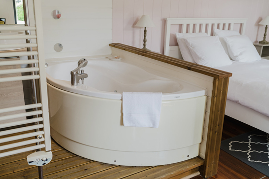 The cocoon-style Bridal Studio, in powdered and golden tones, 160*200 bed, approximately 30m2, bathroom with shower, bathtub and WC open to the bedroom, flat screen TV, free wifi access and equipped kitchenette.