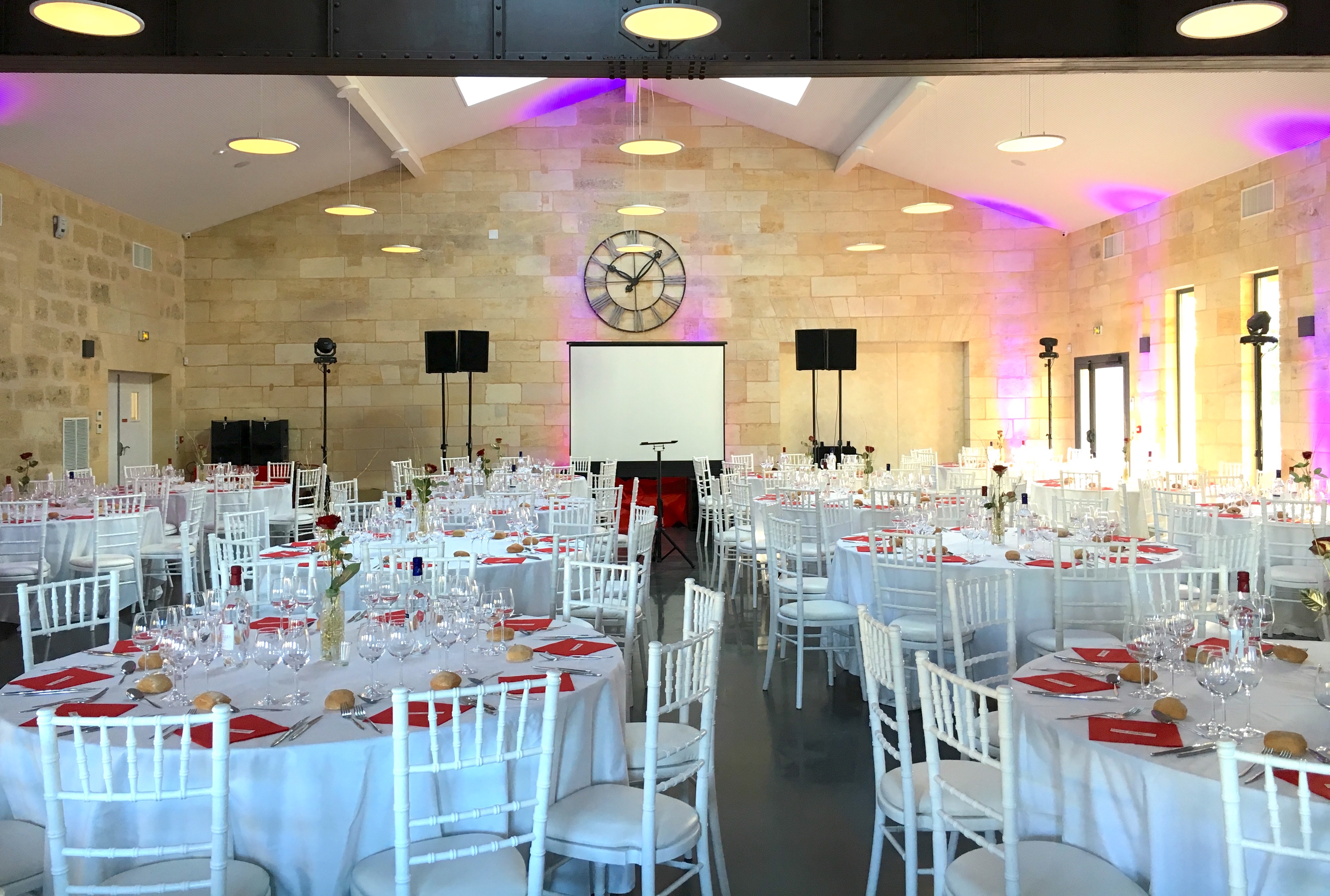 La majestueuse Salle des Vendangeurs de 300m2 a conservé ses murs en pierre datant du XVIII ème siècle et une somptueuse poutre appartenant au pont Eiffel ce qui fait tout son charme.
